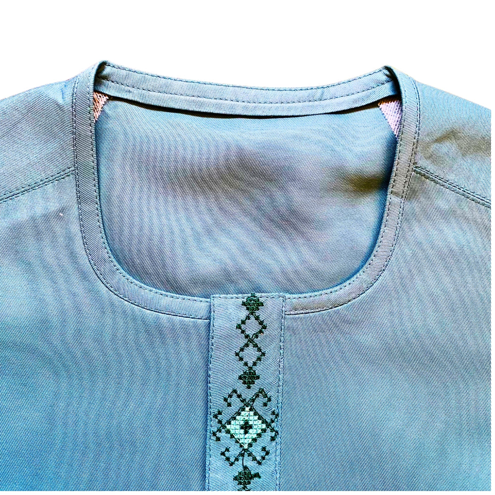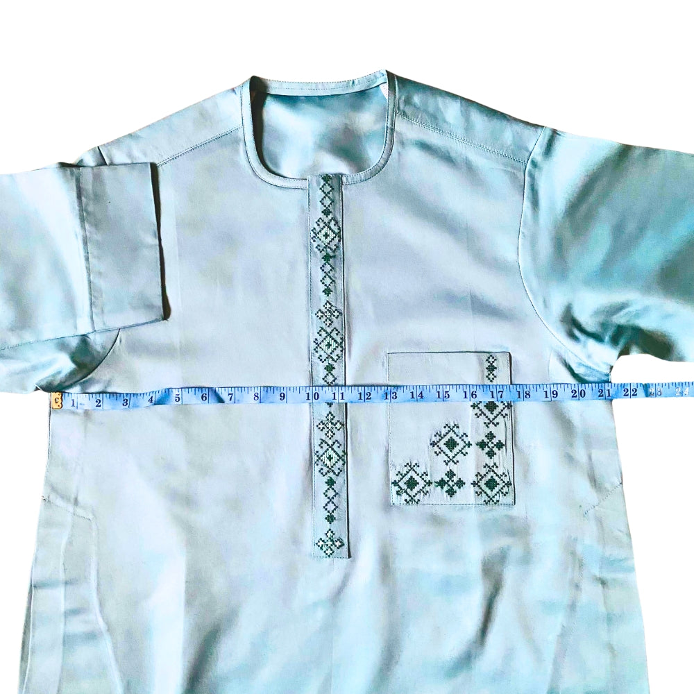Exceptional Prime Collection, Kaftan Men's Outfit, Long Sleeves with Embroidered Placket and Pocket, Teal Color, Round Neck, Top with Side Pockets and Chest Pocket, Pant with Pockets, Breathable and Durable Fabric, Elastic Banded Pants with Girding Rope, Style for All Season, Corporate and Casual Style, Suitable for Church Outfit, Weddings, Parties and Festivals