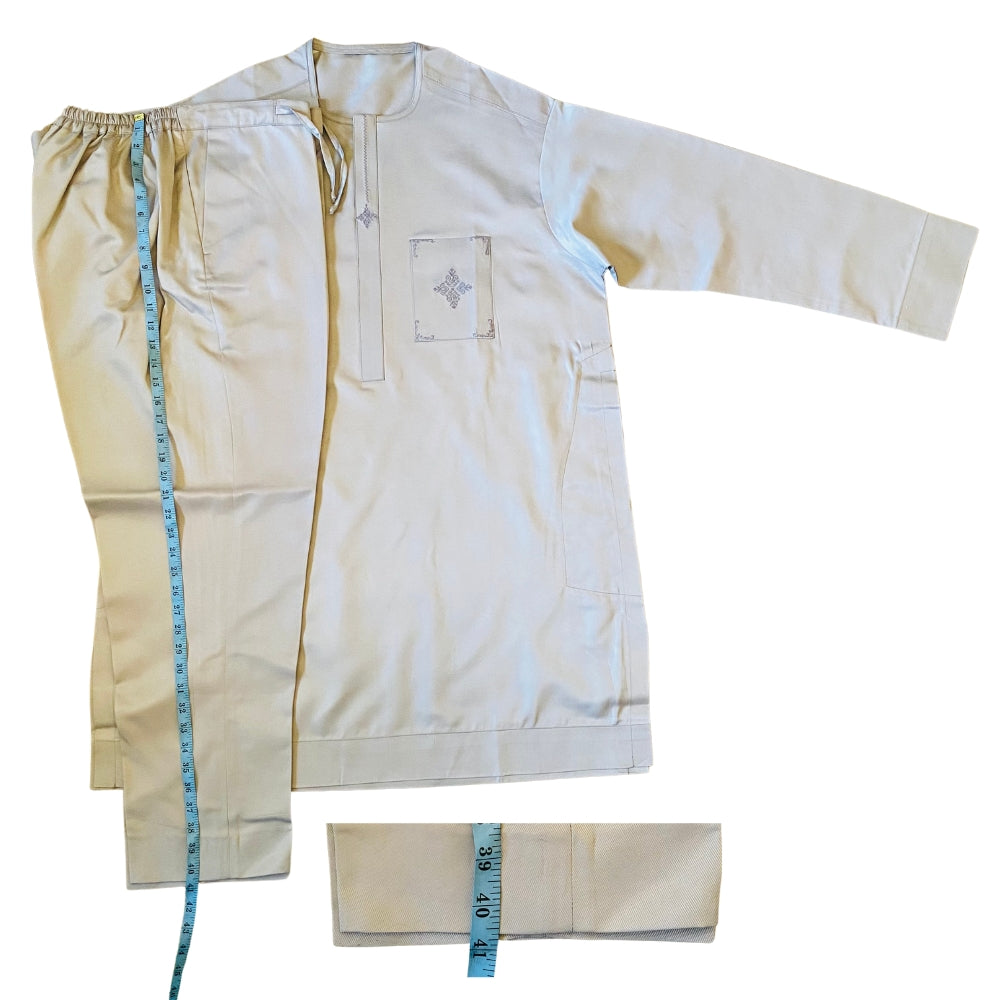Exceptional Prime Collection, Kaftan Men's Outfit, Long Sleeves with Embroidered Placket and Pocket, Cream Color, Round Neck, Top with Side Pockets and Chest Pocket, Pant with Pockets, Breathable and Durable Fabric, Elastic Banded Pants with Girding Rope, Style for All Season, Corporate and Casual Style, Suitable for Church Outfit, Weddings, Parties and Festivals