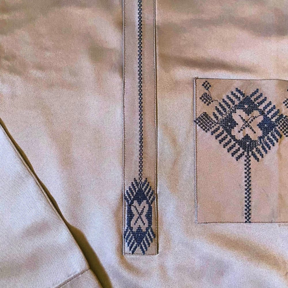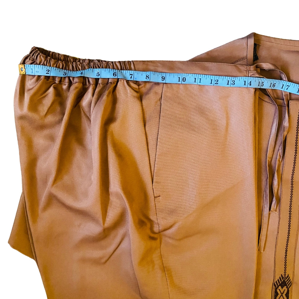 Exceptional Prime Collection, Kaftan Men's Outfit, Long Sleeves with Embroidered Placket and Pocket, Tan Brown Color, Round Neck, Top with Side Pockets and Chest Pocket, Pant with Pockets, Breathable and Durable Fabric, Elastic Banded Pants with Girding Rope, Style for All Season, Corporate and Casual Style, Suitable for Church Outfit, Weddings, Parties and Festivals